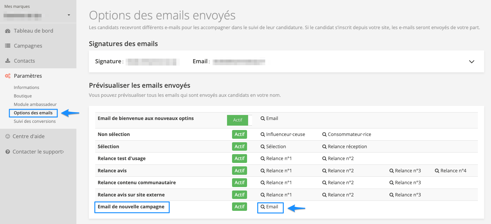 Pour cela, cliquez sur votre marque, en haut du menu latéral à gauche de votre écran puis dans Paramètres et dans Options des emails