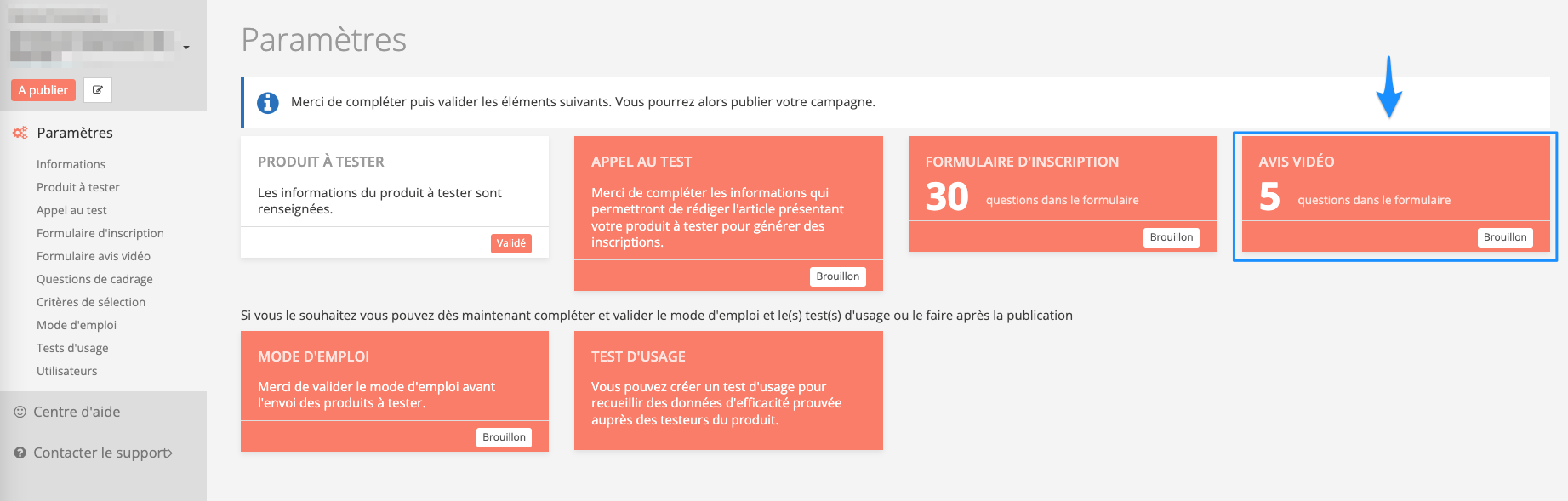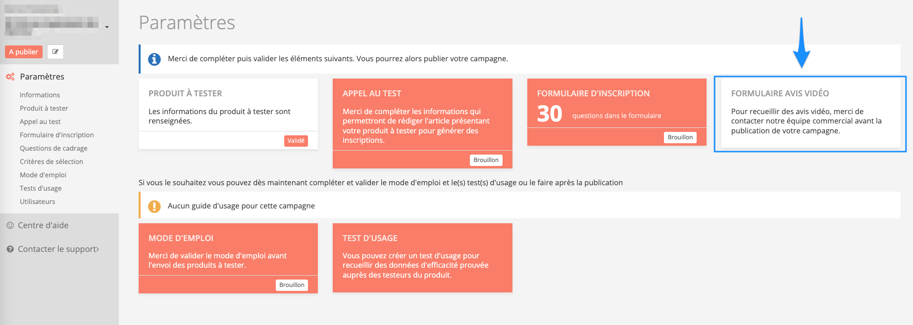 Sélectionnez la campagne où l'option des avis vidéos est activée et cliquez sur "Paramètres" dans le menu latéral à gauche puis dans "Formulaire avis vidéo".