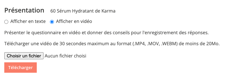 Vous avez la possibilité d’utiliser le titre par défaut du formulaire (titre de la campagne), d'écrire une phrase personnalisée pour introduire le questionnaire ou de télécharger une vidéo de vous présentant le questionnaire.