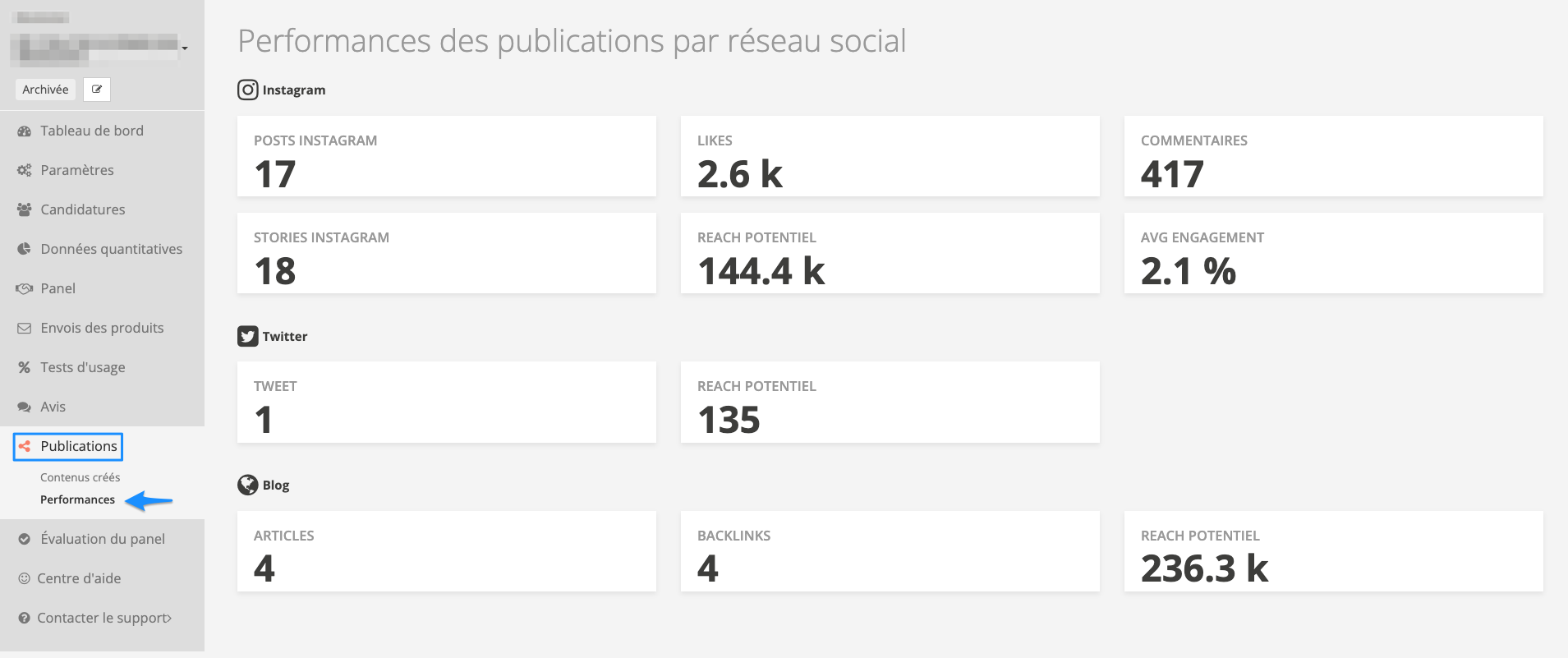 Le tableau de bord des performances des publications affiche plusieurs statistiques concernant les publications réalisées par les ambassadeurs dans le cadre d'une campagne.