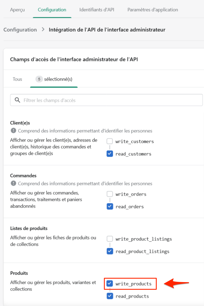 - write_products (nouveau droit à activer)