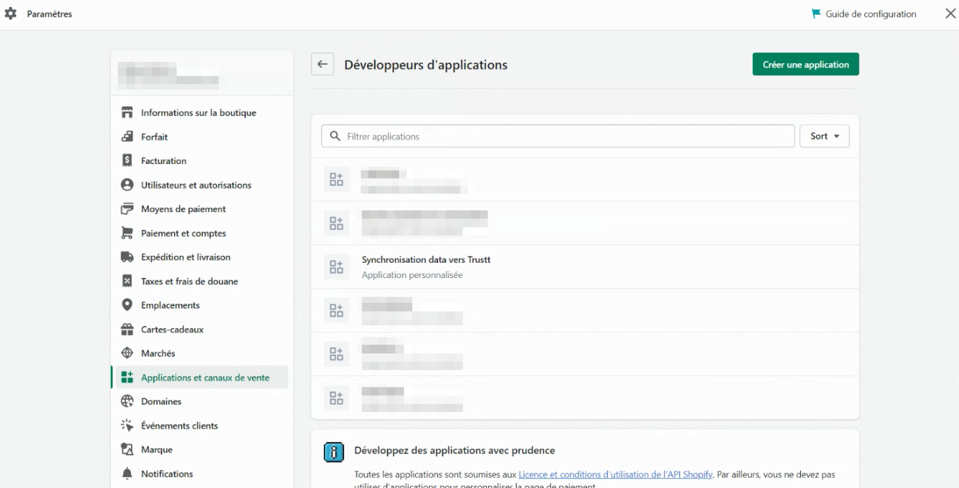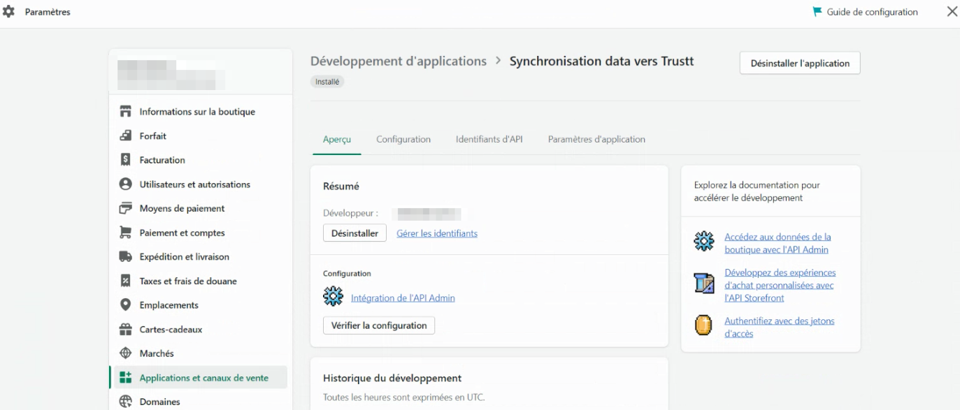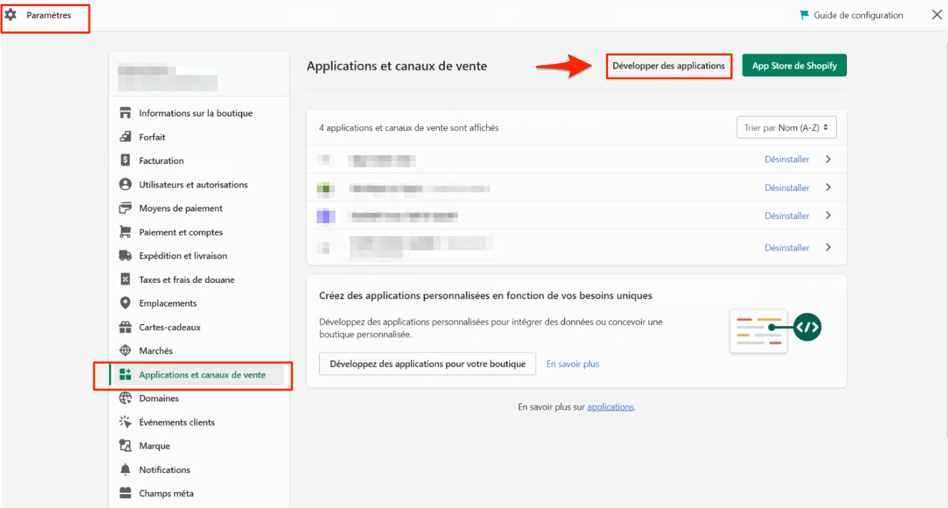 Cliquez dans Paramètres puis Applications et Canaux de ventes et Développer des applications