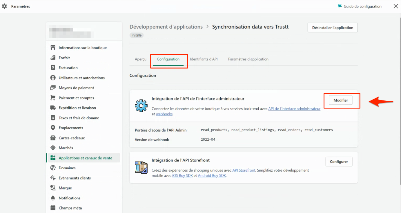 Configuration dans l'espace administration de la boutique Shopify