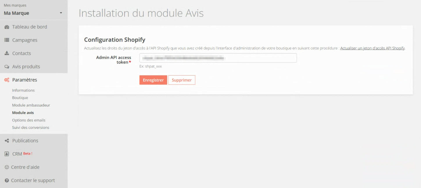 Cliquer sur le bouton orange " Actualiser le jeton d'accès à l'API Shopify" pour afficher le formulaire suivant :