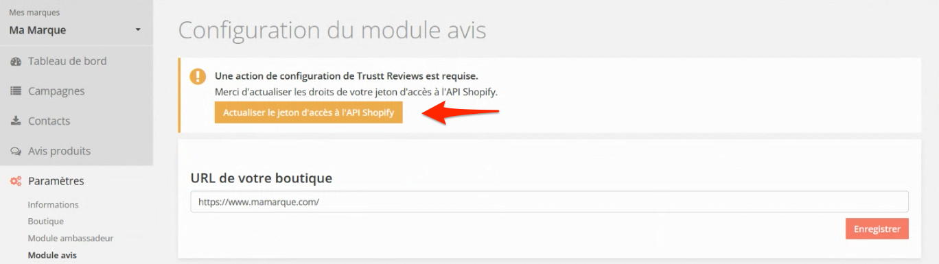 Se connecter dans Trustt, cliquer sur la marque concernée, puis afficher la page Paramètres / Module Avis :