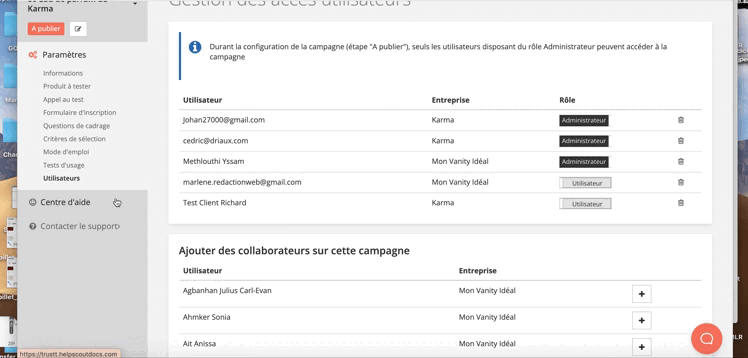 Lorsque vous êtes sur le dashboard d’une campagne, rendez-vous sur l’onglet “ Paramètres”→ “Utilisateurs”, et cliquez sur "Ajoutez des collaborateurs sur cette campagne” : choisissez la personne de votre choix puis cliquez sur le bouton +.