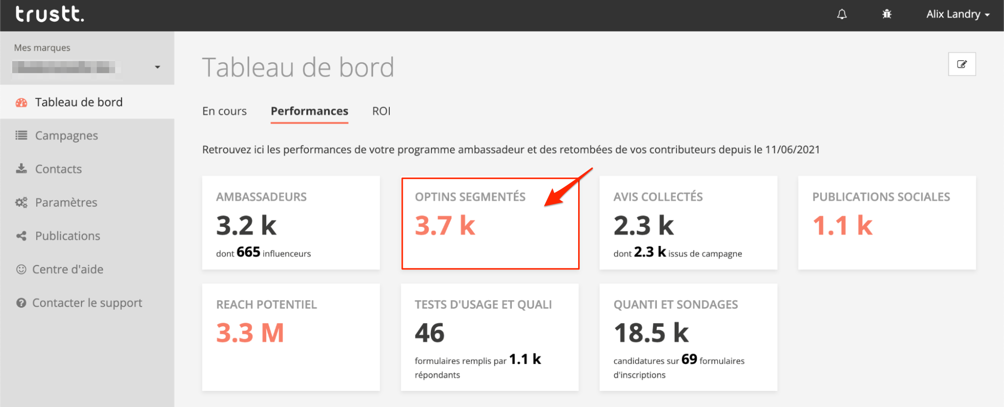 Pour récupérer toutes les adresses mails de vos différentes campagnes, allez sur votre tableau de bord, de votre marque et cliquez sur le bloc " Optins Segmentés"