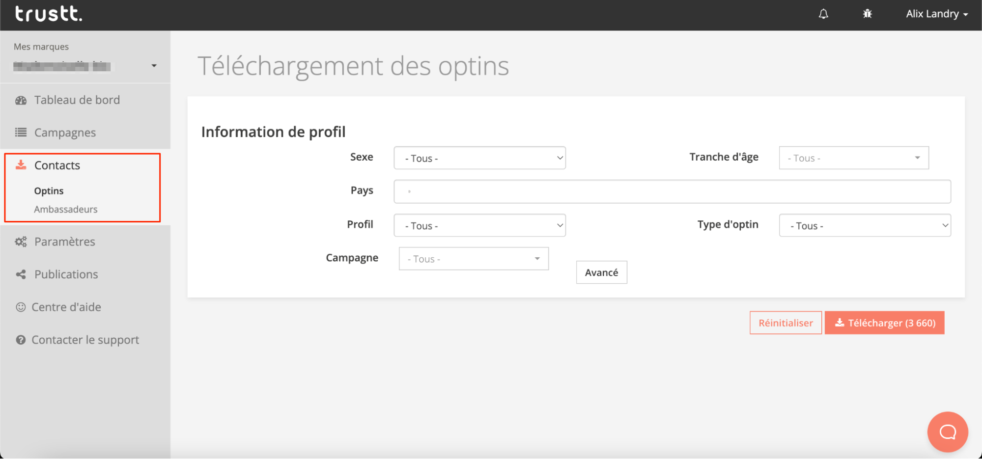 Vous pouvez télécharger les optins selon plusieurs critères (sexe, tranche d’âge, profil etc.)