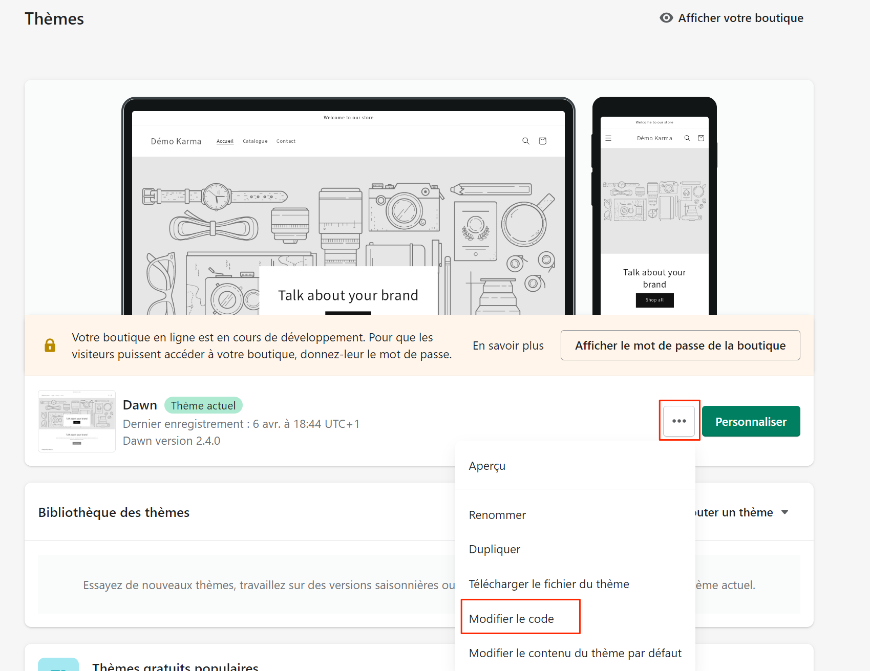 Puis cliquer sur le bouton “ ” puis sur le sous-menu “Modifier le code“ :