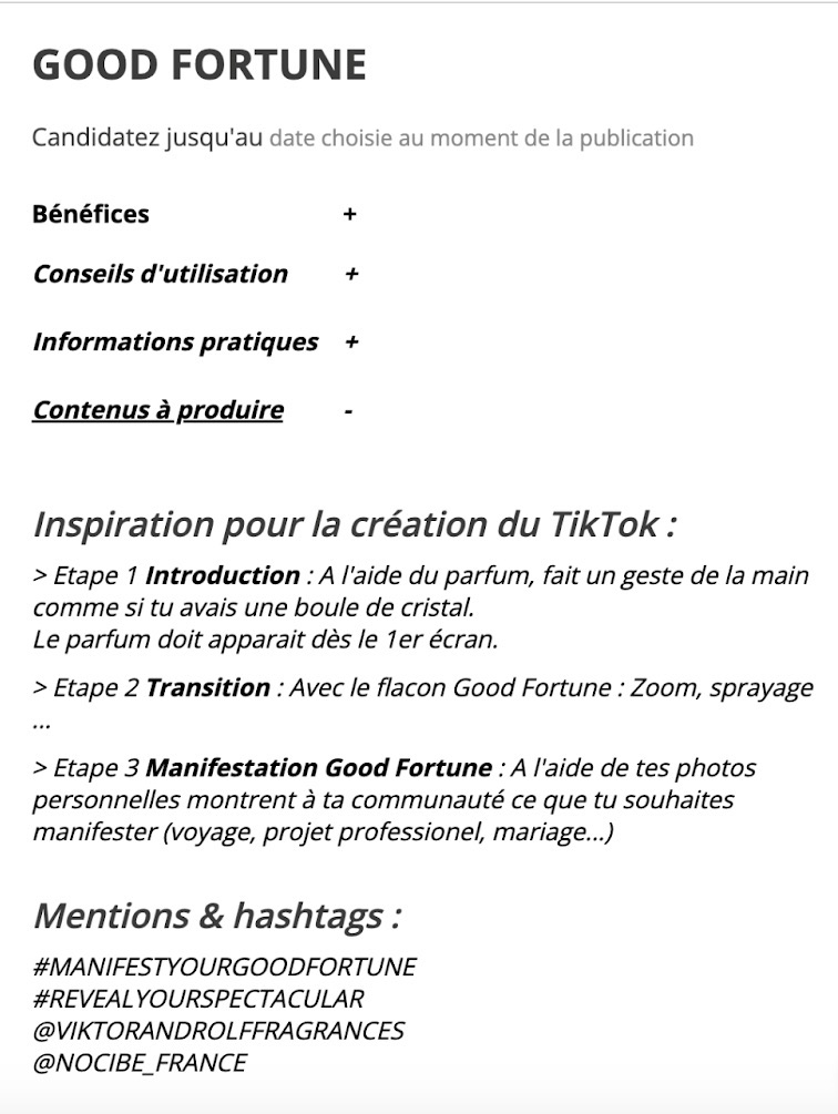 Pour une campagne TikTok d’un parfum de Viktor & Rolf, le brief donnait des indications sur les différentes étapes de la vidéo : comment montrer le parfum, comment faire la transition ?