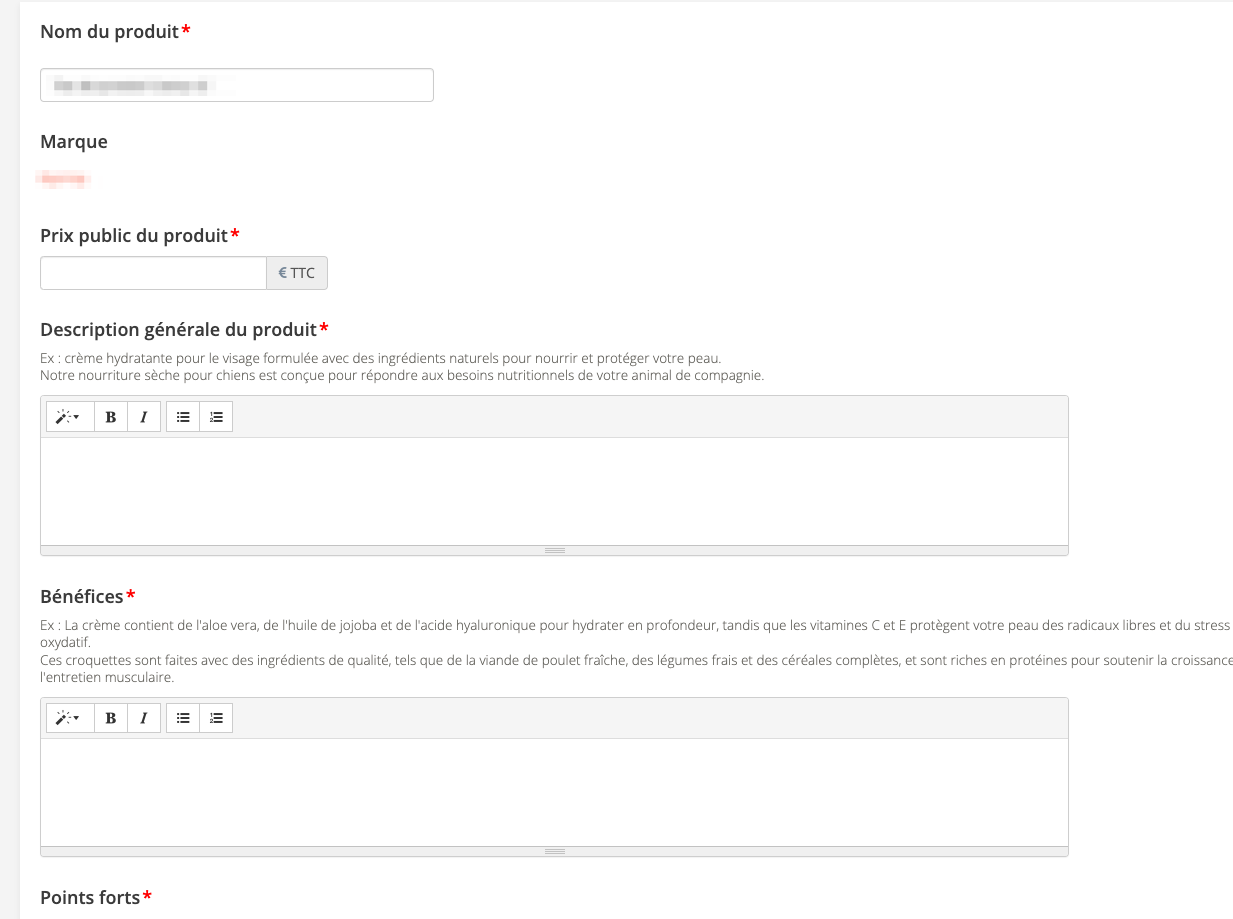Les différents champs vous permettent de renseigner toutes informations relatives au produit.