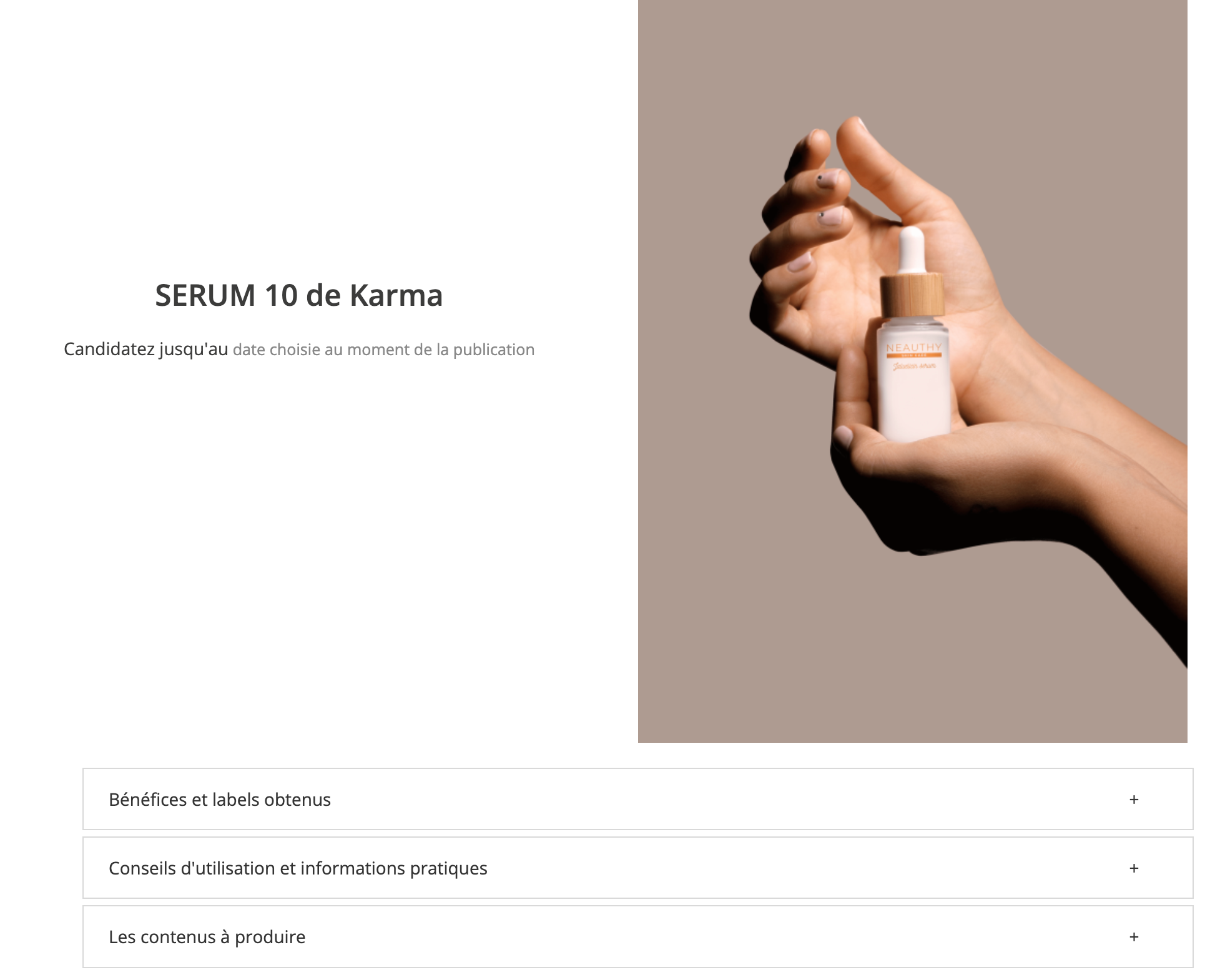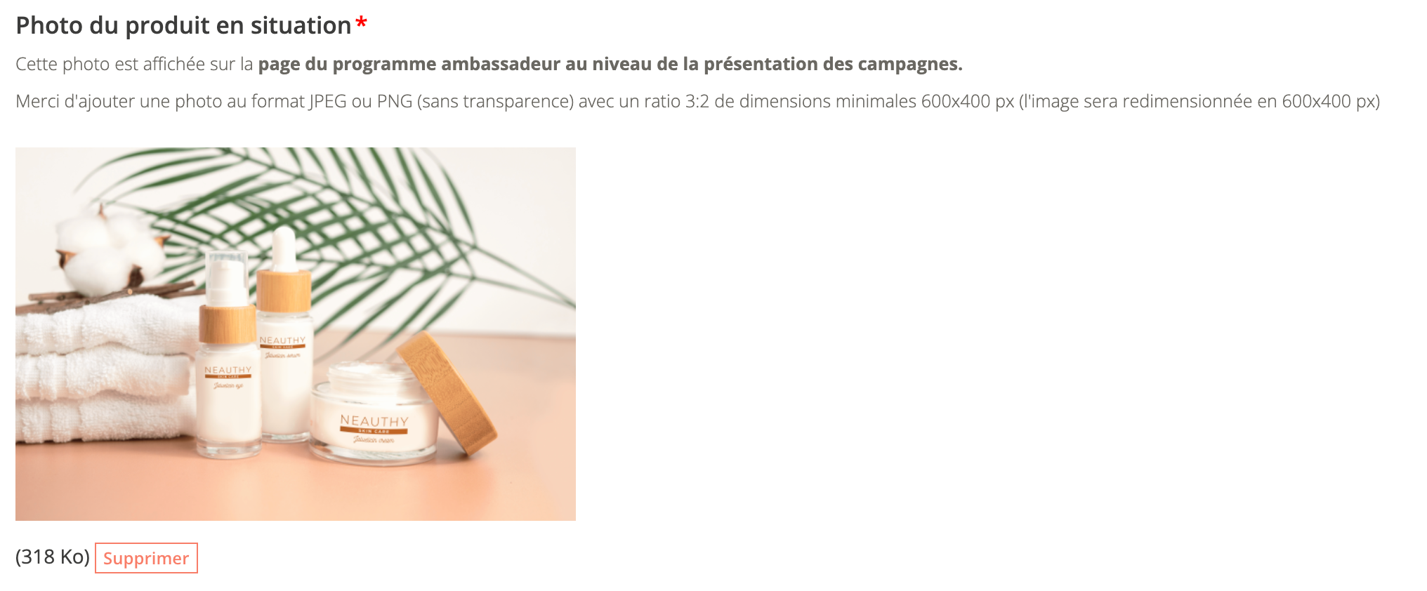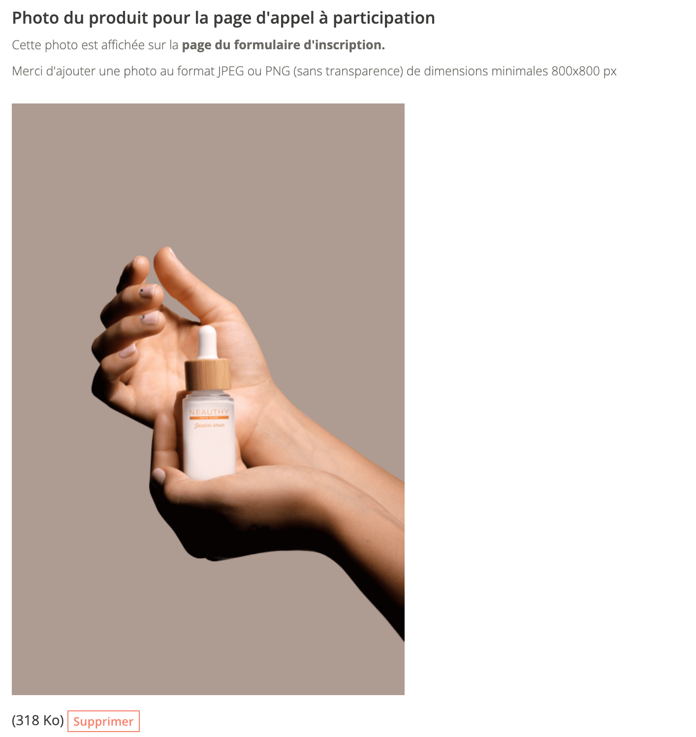 Cette photo apparait au dessus du formulaire d'inscription, et juste avant les informations remplies précédemment : Bénéfices et labels obtenus, conseils d'utilisation et informations pratiques, le contenu à produire.