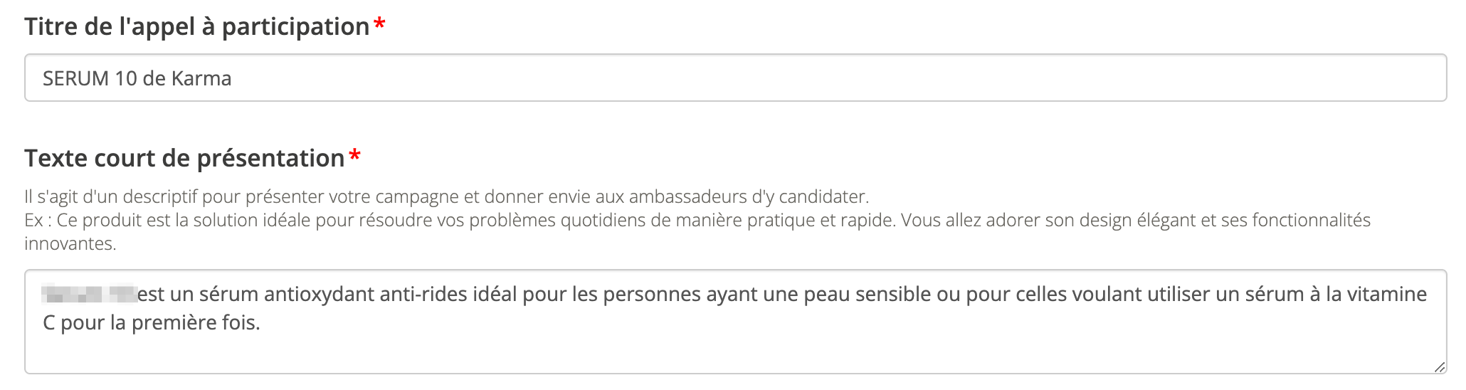 Ici, vous pouvez modifier le titre de l'appel à participation (qui reprend par défaut le titre de la campagne) et ajouter un texte d'introduction qui s'affichera à gauche du visuel en situation.