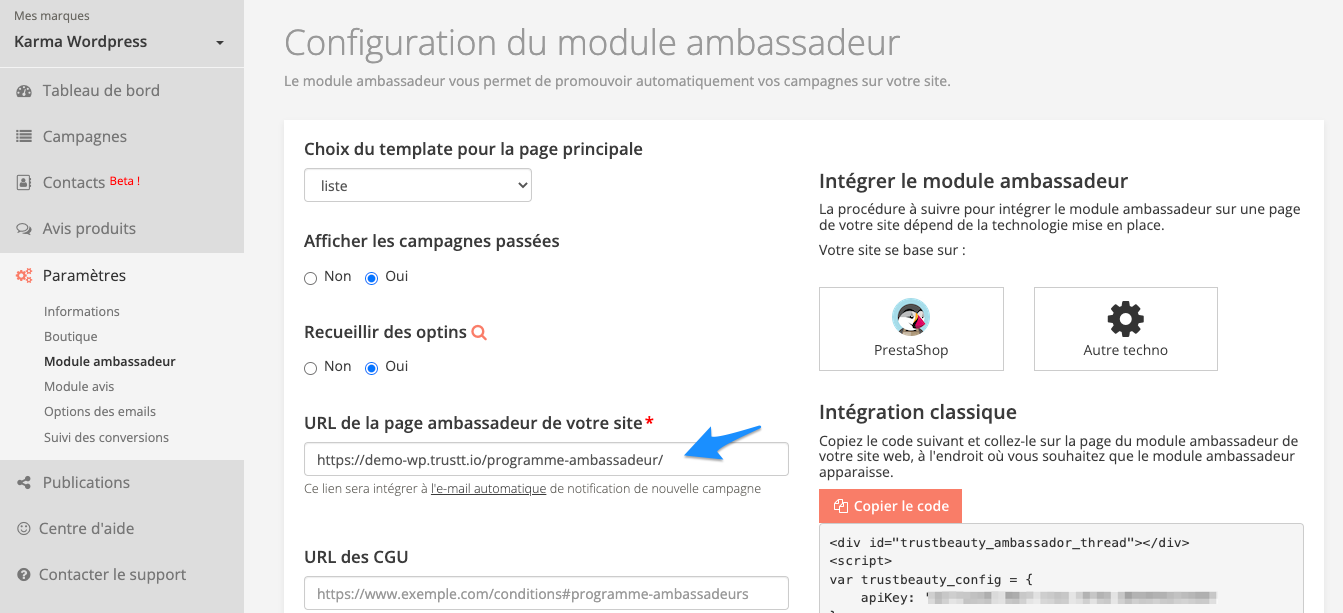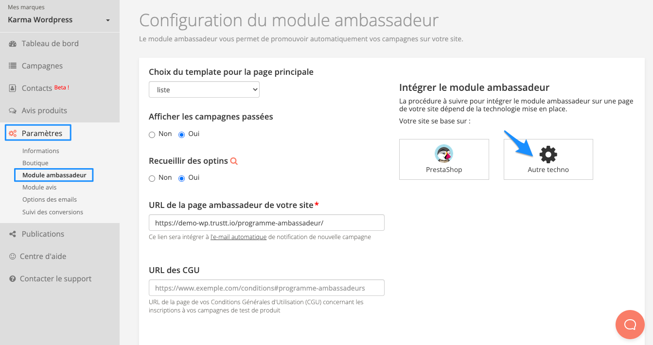 Dans le menu latéral à gauche, cliquez sur Paramètres et Module Ambassadeur.