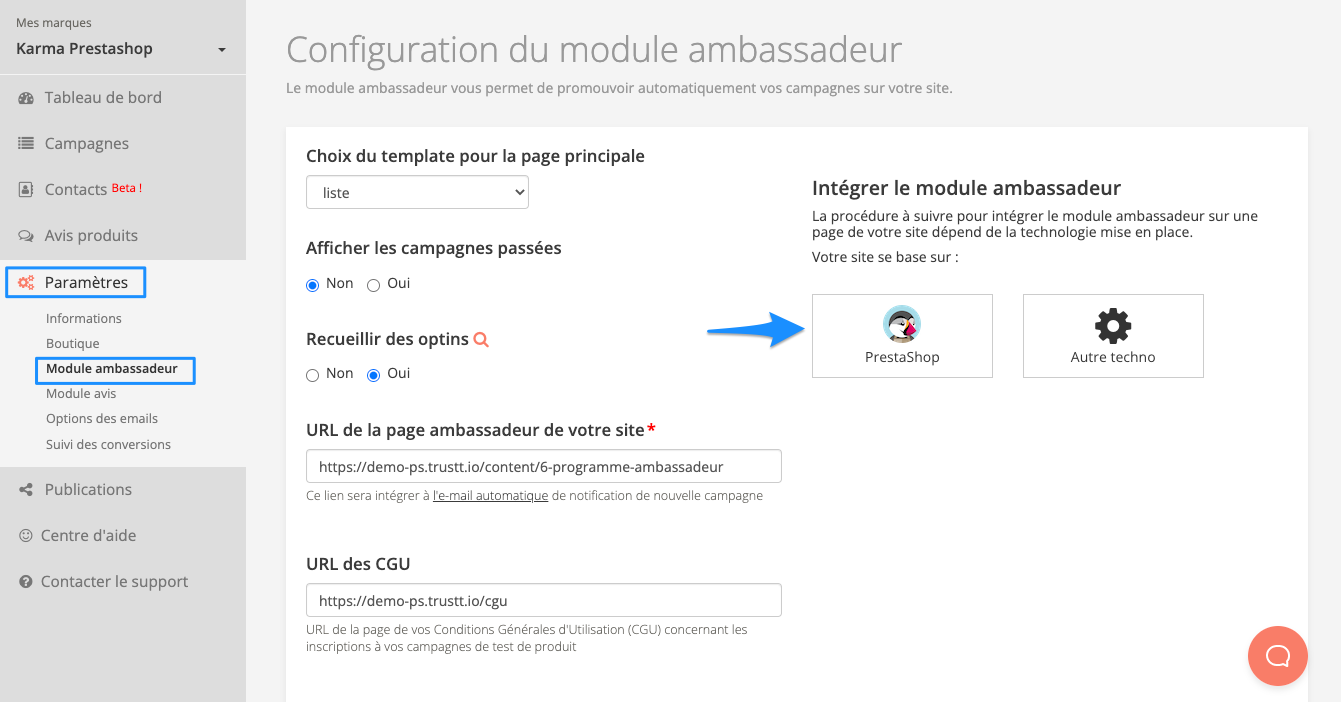Dans le logiciel Trustt, allez dans le menu latéral à gauche, cliquez sur Paramètres et Module Ambassadeur. Dans la page de configuration du module ambassadeur, cliquez sur Prestashop.