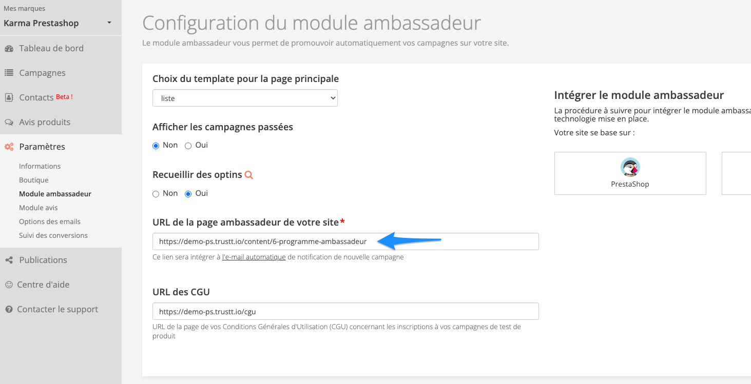 N'oubliez pas de renseigner l'URL publique de votre programme ambassadeur dans le champ prévu dans les paramètres du module ambassadeur.