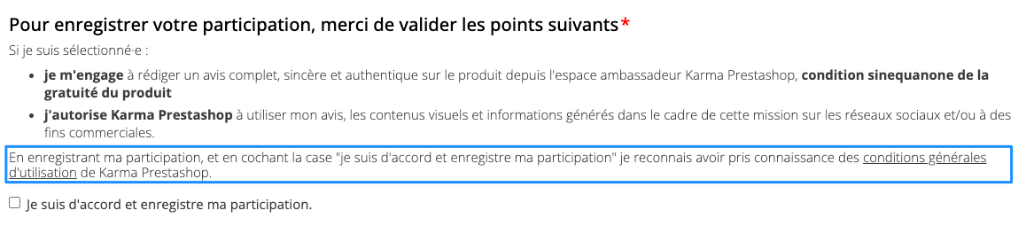 Si vous avez une page de CGU, renseignez son URL dans le champ au-dessous de l'URL du programme ambassadeur. Le lien des CGU sera affiché au niveau des engagements, juste avant que les candidats valident leur inscription.