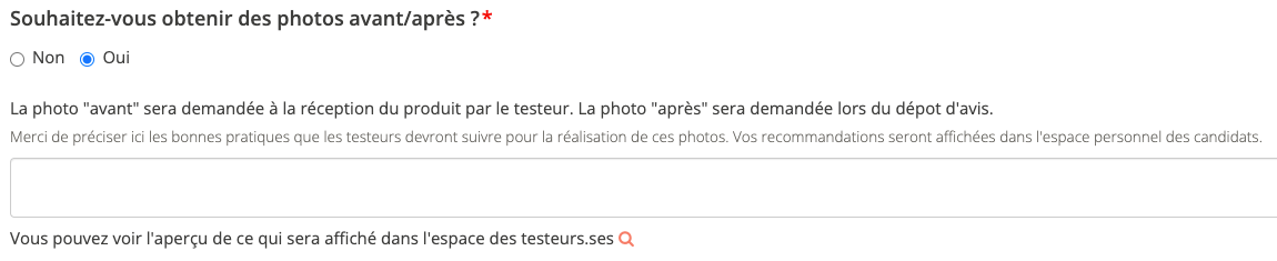 Ces photos sont demandées seulement aux ambassadeurs.rices sélectionné.es dans le cadre d'une campagne ambassadeur. La photo "avant" est demandée lors du démarrage de la campagne ; la photo "après", lors du dépôt de l'avis en fin de campagne.